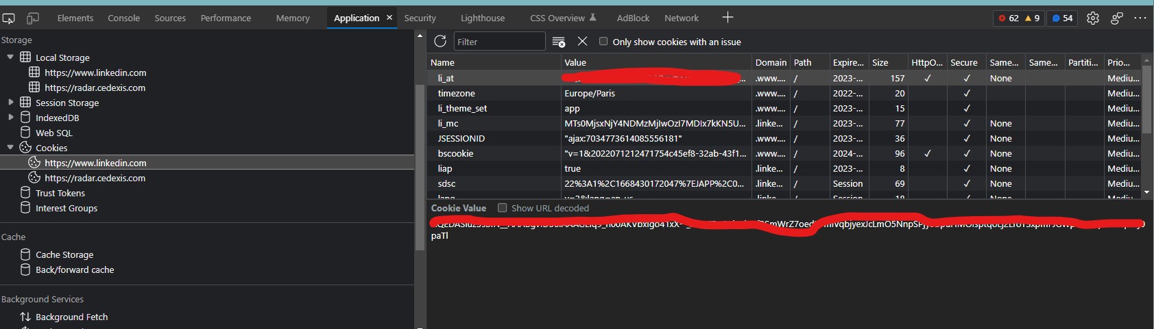 To get your linkedin cookie, you can go to linkedin in your normal browser, login and go to the developer tools, then go to Application > Cookies > https://www.linkedin.com > li_at . You should see something like below
